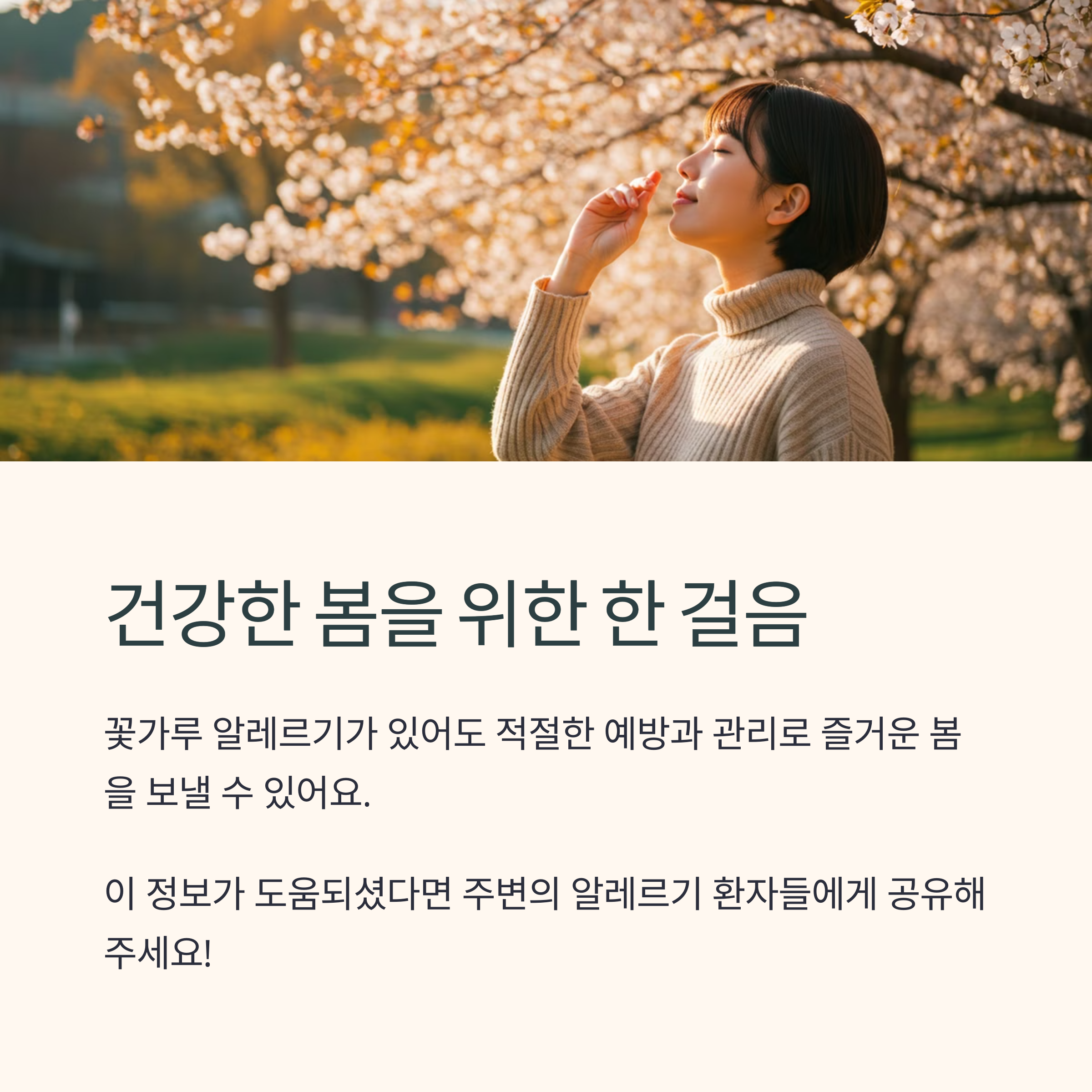 오늘 소개한 내용들을 일상생활에 적용하여 꽃가루 알레르기로 인한 불편함을 최소화하고, 건강한 봄을 맞이하시길 바랍니다.