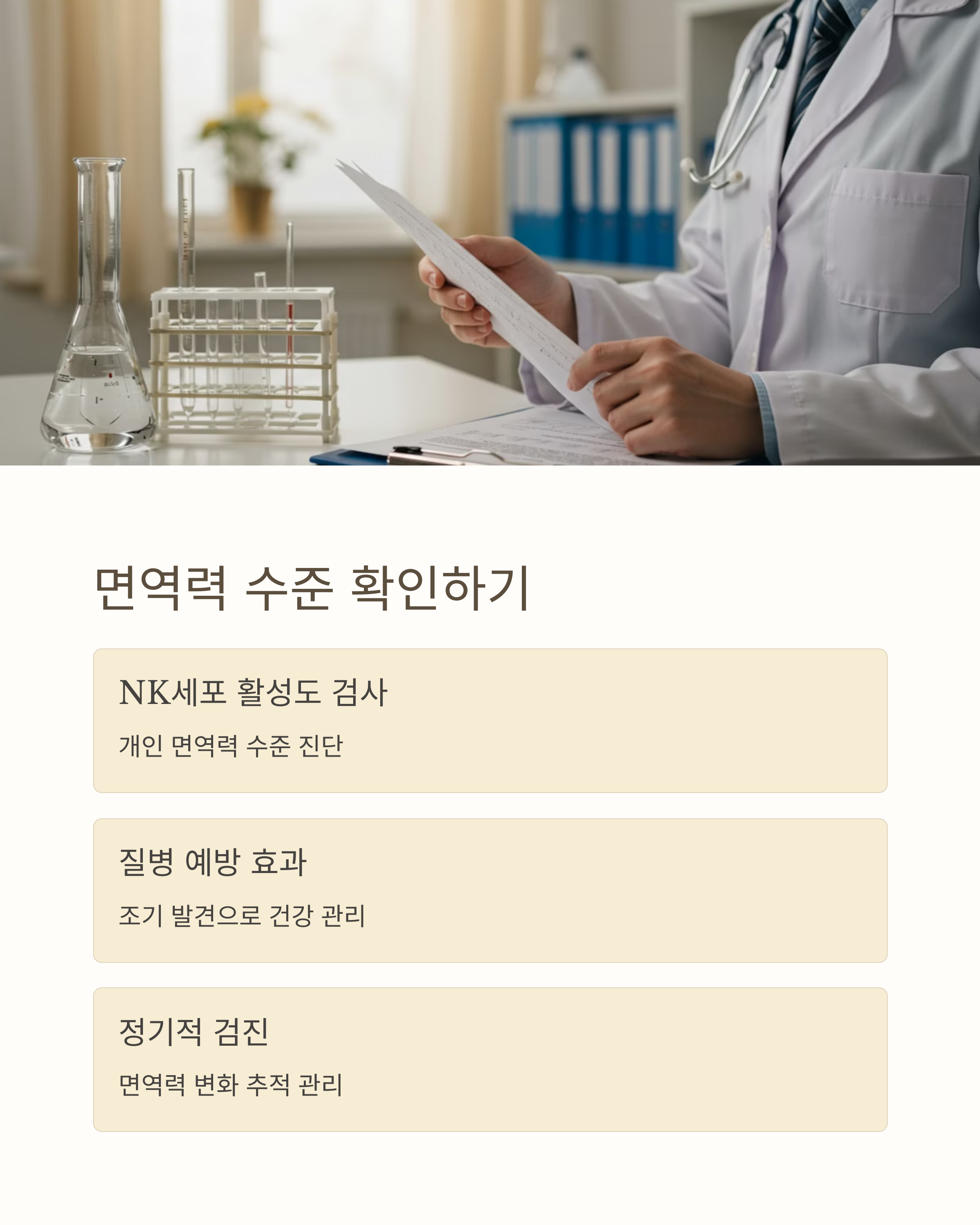 간접적으로는 감염이 자주 발생하거나 회복이 느리다면 NK세포 활성이 낮을 수 있어요.