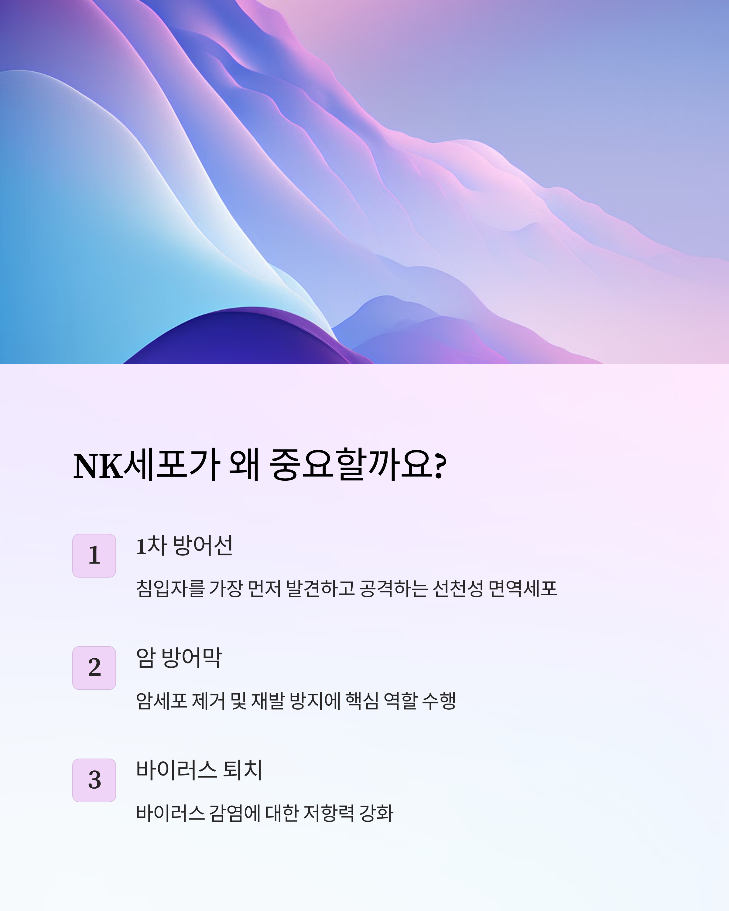NK세포는 우리 몸에 침입한 바이러스나 세균, 그리고 암세포까지도 찾아내서 제거하는 능력을 가진 면역계의 특수부대와 같은 존재랍니다.