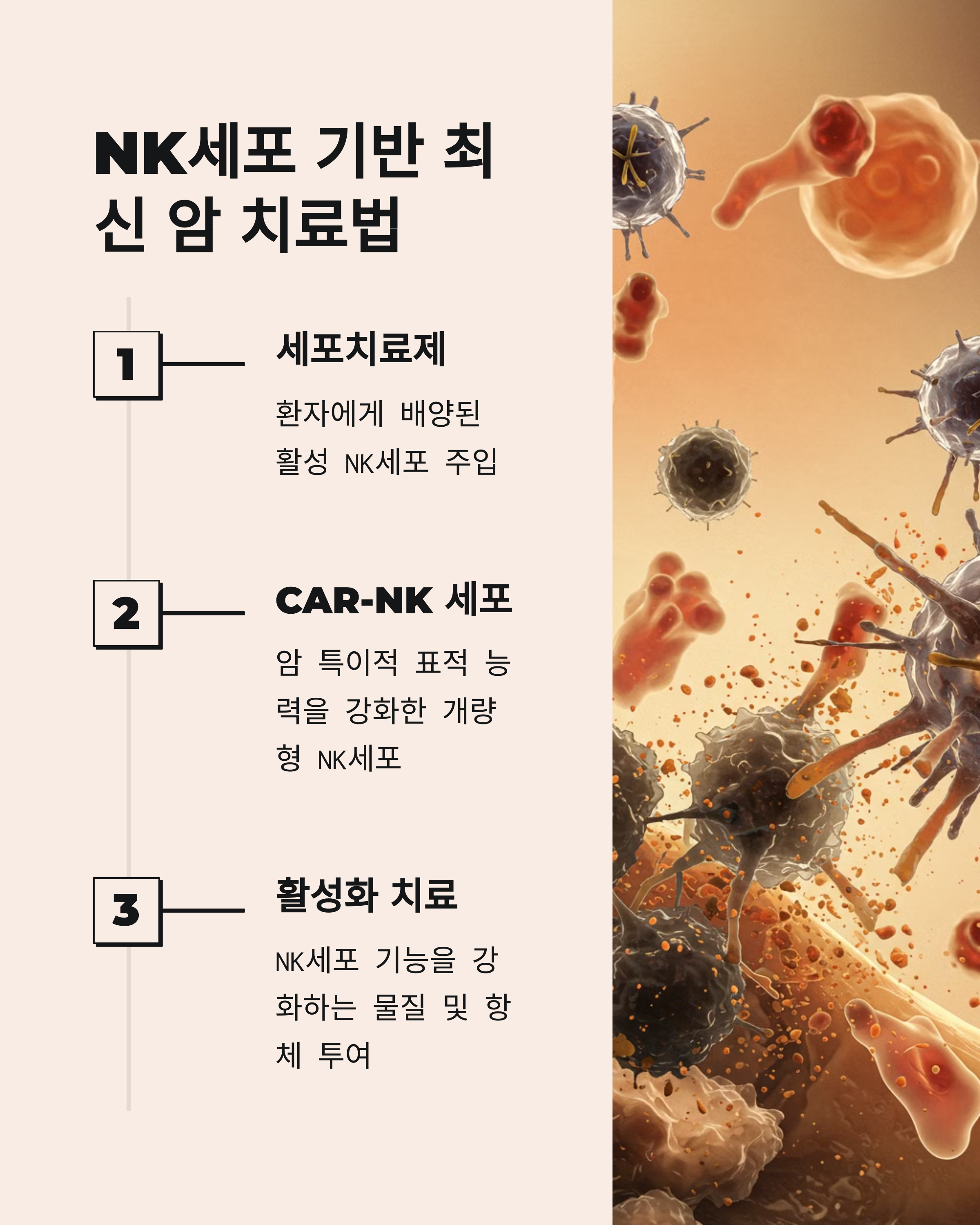 사이토카인이라는 면역 신호 물질(인터루킨-2, 인터루킨-15 등)을 투여하거나, 체크포인트 억제제를 사용해 NK세포의 브레이크를 해제하는 방식으로 이루어집니다.